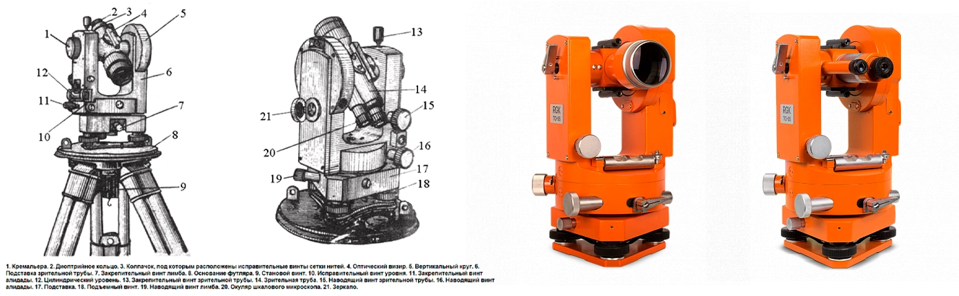 Основной элемент прибора — это визирная труба, а также горизонтальный и вертикальный отсчетные круги. Труба надежно закрепляется между колонками, а сами колонки расположены на специальной подставке (трегере) с тремя регулируемыми винтами. Все это фиксируется на устойчивом геодезическом штативе. Для точной установки и наведения прибора используются различные винты: одни из них корректируют положение, а другие — фиксируют нужное направление.