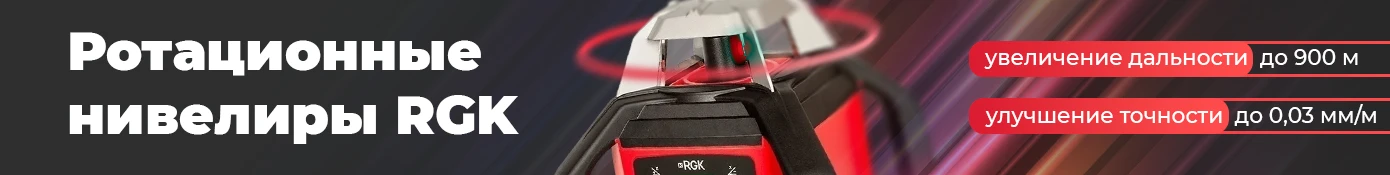 Ротационный лазерный нивелир RGK оснащен вращающейся головкой, которая формирует горизонтальную или вертикальную плоскость с разверткой в 360 °. Такие приборы обладают большой дальностью проецирования, которая достигает у профессиональных моделей 400 м с использованием приемника.