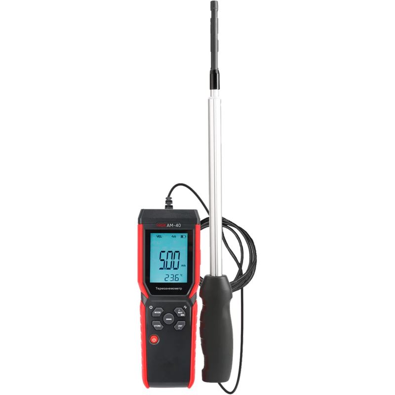 Термоанемометр RGK AM-40 имеет продуманную конструкцию, состоящую из компактного основного блока и выносного телескопического зонда. Такое решение обеспечивает гибкость при проведении замеров в труднодоступных местах, например, внутри узких вентиляционных коробов. Корпус основного блока разработан для удобного хвата, позволяя удерживать прибор одной рукой во время работы, и снабжен рельефными вставками, предотвращающими выскальзывание.