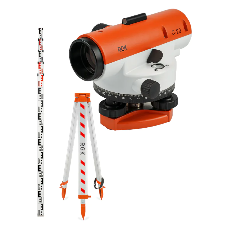 Оптический нивелир RGK C-20 с поверкой, рейка AMO S5 и штатив S6-N — комплект измерительных приборов для строительных, геодезических и инженерных работ. Использование фирменных инструментов и принадлежностей гарантирует точность результата.