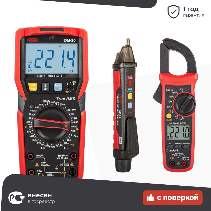 RGK DM-20 цифровой мультиметр с поверкой, с токовыми клещами CM-10 и индикатором напряжения AC-12 779647/779678/776394 в Воронеже