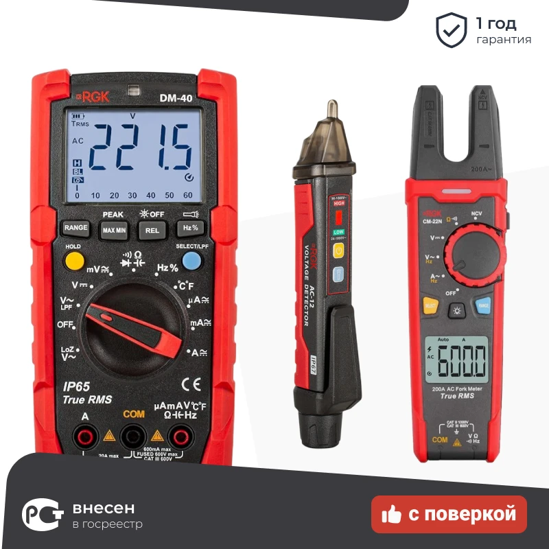RGK DM-40 цифровой мультиметр с поверкой, с токовыми клещами CM-22N и индикатором напряжения AC-12 779661/721487/776394 в Воронеже