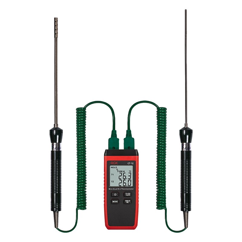 Основные преимущества устройства — широкий диапазон измерения, надежность, простота использования и компактность. Контактный термометр RGK оснащен ЖК-дисплеем для вывода измеренных показаний, отображения индикаторов состояния и режимов вычислений. С помощью функциональных клавиш можно выбрать единицы измерения и тип термопары, вывести минимальные, максимальные, средние или текущие значения. Для определения разницы температур между термопарами достаточно нажать на одну кнопку. Полученную информацию удобно фиксировать благодаря функции удержания данных на экране.