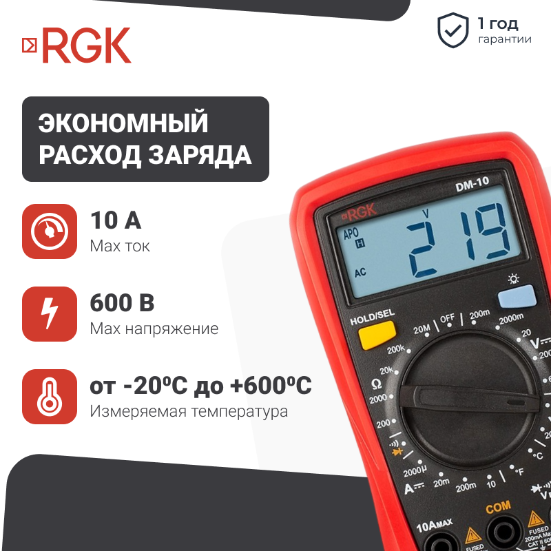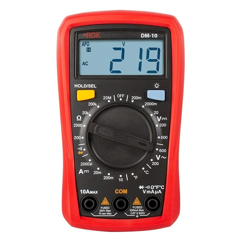 Цифровой мультиметр RGK DM-10 – это прибор для измерения различных параметров электросетей, диагностики оборудования, проверки диодов на работоспособность и прозвонки цепей. За счет компактных размеров и легкости освоения основных функций, эта модель - отличный выбор для домашнего использования.
