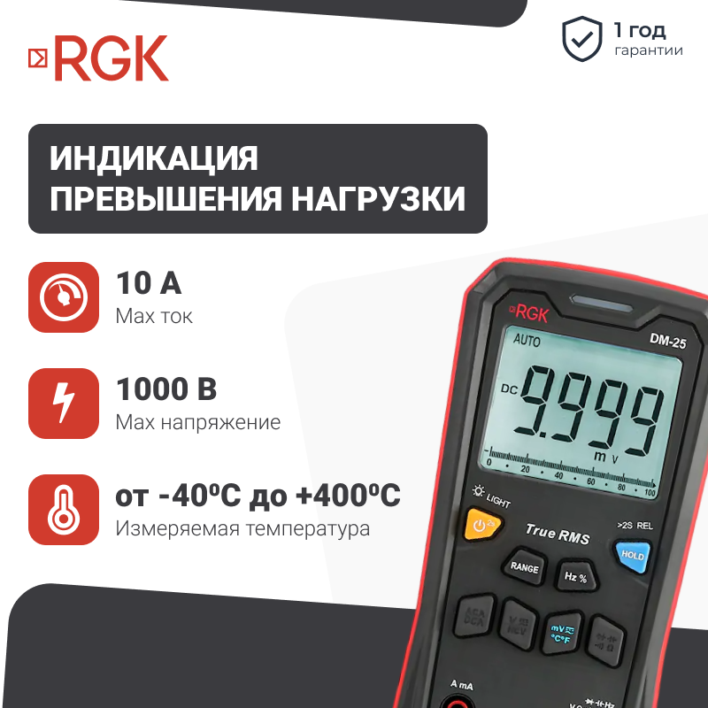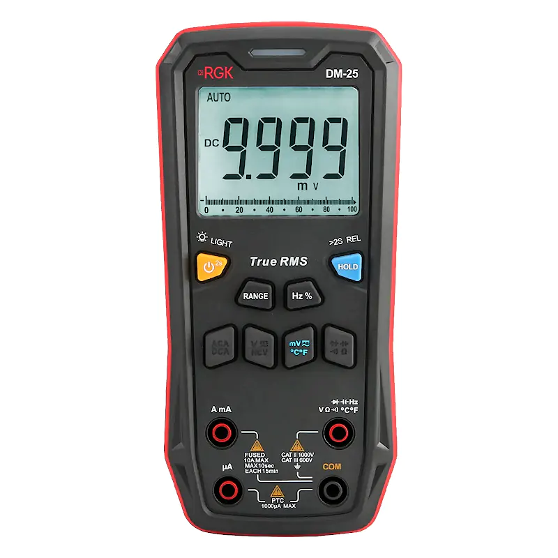 Дисплей оснащен яркой подсветкой для улучшения обзора в слабоосвещенных местах. Индикатор низкого заряда подсказывает, когда необходимо заменить батареи для поддержания устройства в рабочем состоянии и сохранения точности измерений. На задней панели предусмотрена откидная подставка для установки на стол и удобного снятия показаний. В целях экономного энергопотребления прибор автоматически отключается через 15 минут при отсутствии каких-либо действий с функциональными клавишами. Мультиметр RGK DM-25 поставляется вместе с элементами питания, термопарой типа «К» и комплектом измерительных кабелей с пробниками.