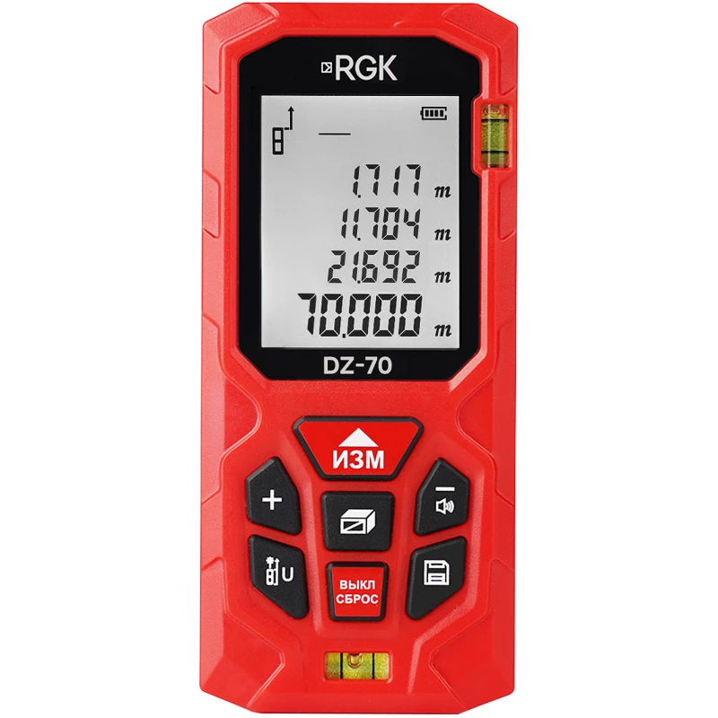 Лазерный дальномер RGK DZ-70 представляет собой мобильный прибор компактного класса с крупноразмерным дисплеем с подсветкой, который позволяет быстро определять дистанцию до выбранных объектов в диапазоне дальностей до 70 м с 2-миллиметровой точностью. Благодаря встроенным вычислительным функциям, изделие может использоваться для измерения площадей, объемов и недоступных расстояний, выполняя расчеты по результатам серии предварительных замеров. Возможность измерения вертикальных и горизонтальных дистанций обеспечивают поперечный и продольный цилиндрические уровни пузырькового типа, размещенные на лицевой панели и позволяющие визуально контролировать правильность положения изделия в момент замера.