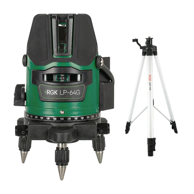Лазерный уровень RGK LP-64G со штативом LET-170 – прибор, который проецирует 1 горизонтальный и 4 вертикальных луча для создания разметки перед ремонтными или строительными работами. Зеленый цвет лазера обеспечит хорошую видимость линий в запыленных условиях или при ярком солнечном свете.