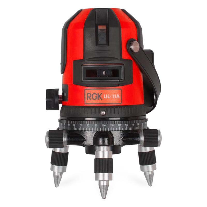 RGK UL-11 с высокой точностью - ±1мм на 5м - строит две перпендикулярных плоскости (вертикальную и горизонтальную) с развёрткой по 110°. С высокой точностью навести плоскость на нужную поверхность позволяет вращающийся на 360° корпус прибора, оснащённый горизонтальным лимбом и двумя винтами точной наводки.