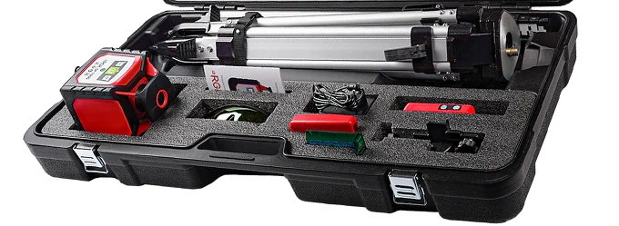 Установите нивелир на раздвижной штатив и управляйте им с пульта ДУ. Это позволит избежать тряски прибора при нажатии кнопок на панели и обеспечит стабильность световой разметки. Верхнюю платформу можно поворачивать вокруг оси. Контрастная шкала нивелирной рейки хорошо видна издалека. Для работы на больших расстояниях в комплектацию входит приемник сигналов с креплением на рейку, мишень, очки, трегер.