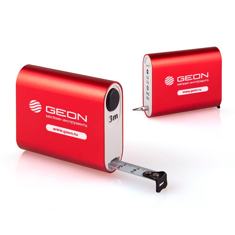 Фирменная красная рулетка на 3 метра от компании Geon с автозажатием и удобным скручиванием при нажатии на кнопку.
